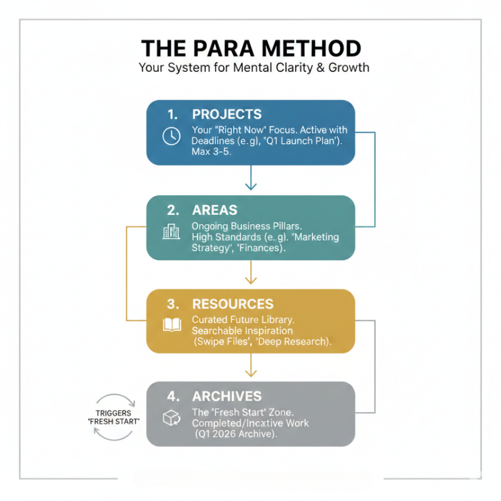 - Implement the PARA System: Move from passive storage to active results by organizing your digital life into four distinct zones: